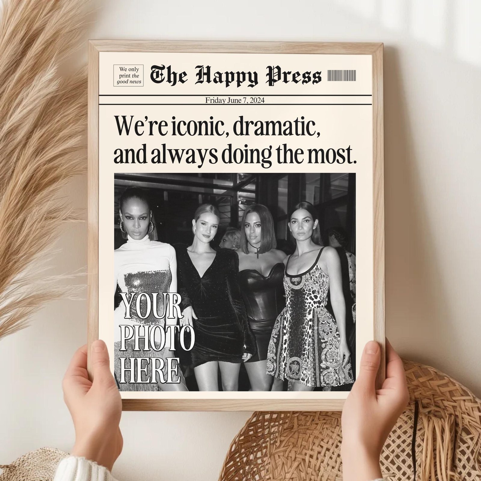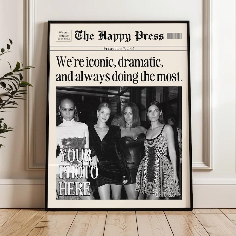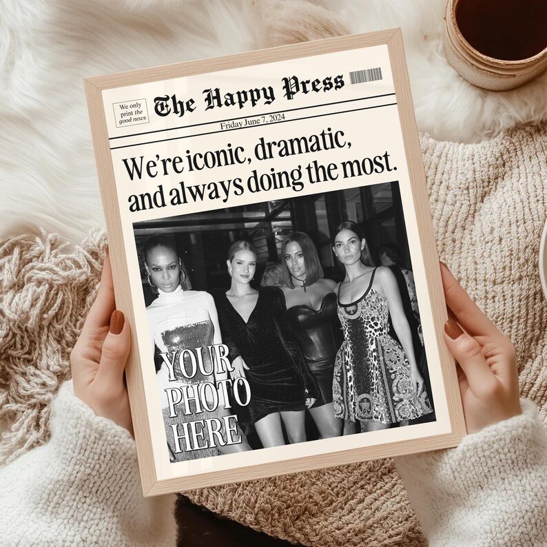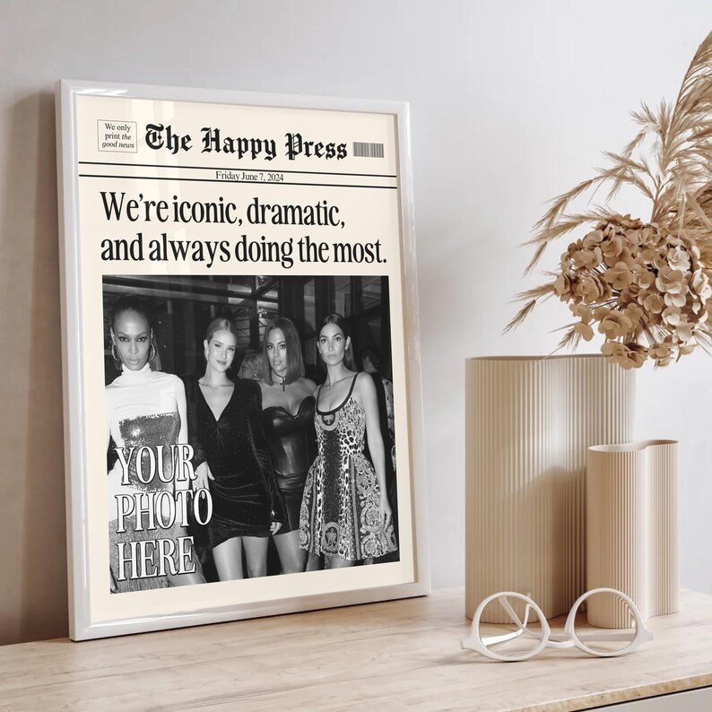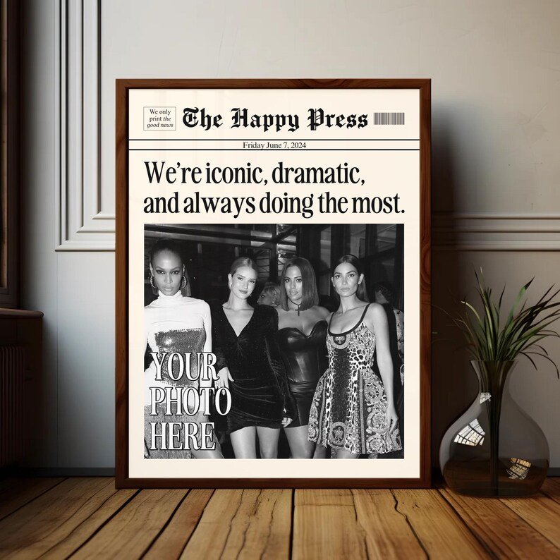 Make your memories timeless with this vintage-inspired custom newspaper print! Whether itâs for your dorm, living room, or as a heartfelt gift, this print will elevate any space with a unique personal touch. Upload your favorite photo, choose your headline, and let me create a piece that feels straight out of a classic newspaper!
