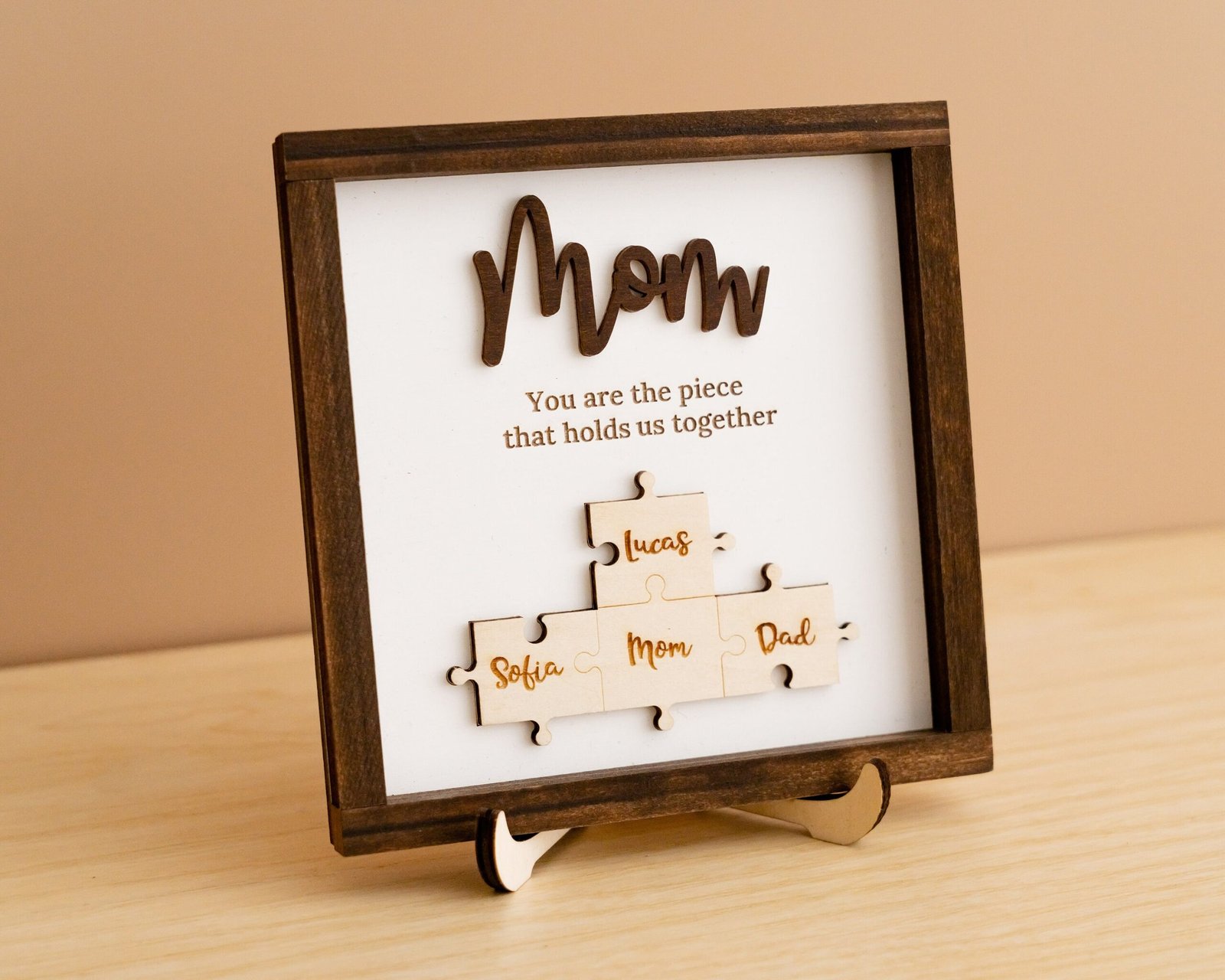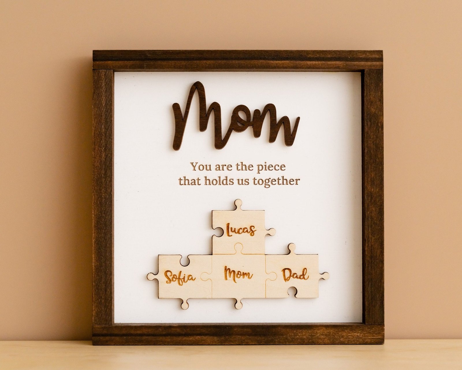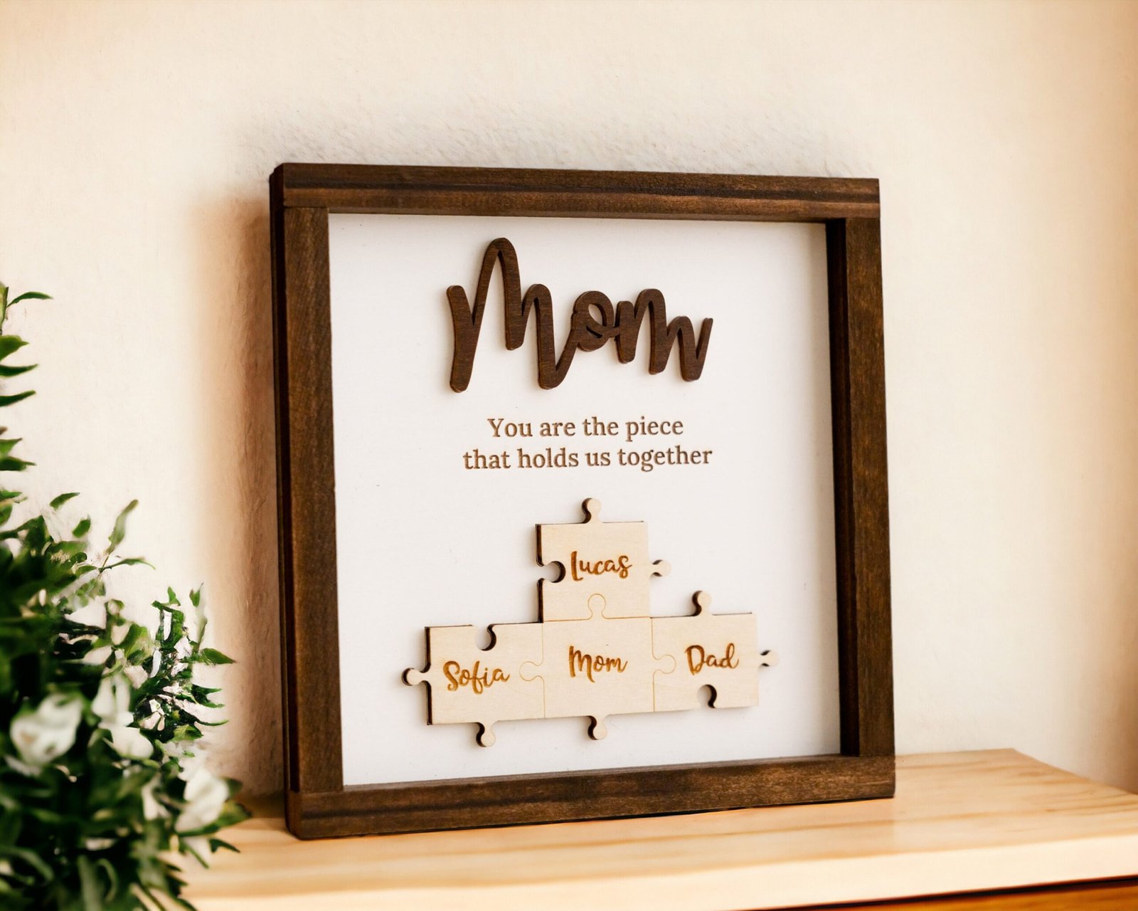 TheĀ Mama Puzzle Piece SignĀ is more than just home dĆ©corāit’s a symbol of love, unity, and appreciation. Designed to reflect the powerful role a mother plays in holding her family together, this handcrafted sign combines elegant design with deep emotional value. Featuring a customizable set of puzzle pieces engraved with children’s or family membersā names, this heartfelt piece is ideal for Motherās Day, birthdays, Christmas, or any time you want to show your gratitude to the matriarch in your life.