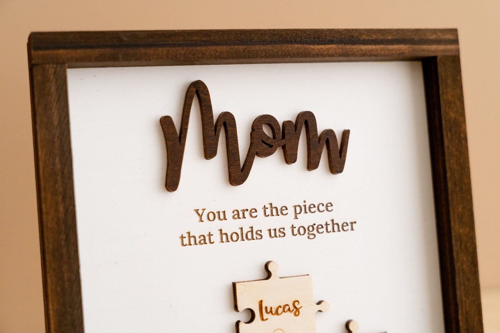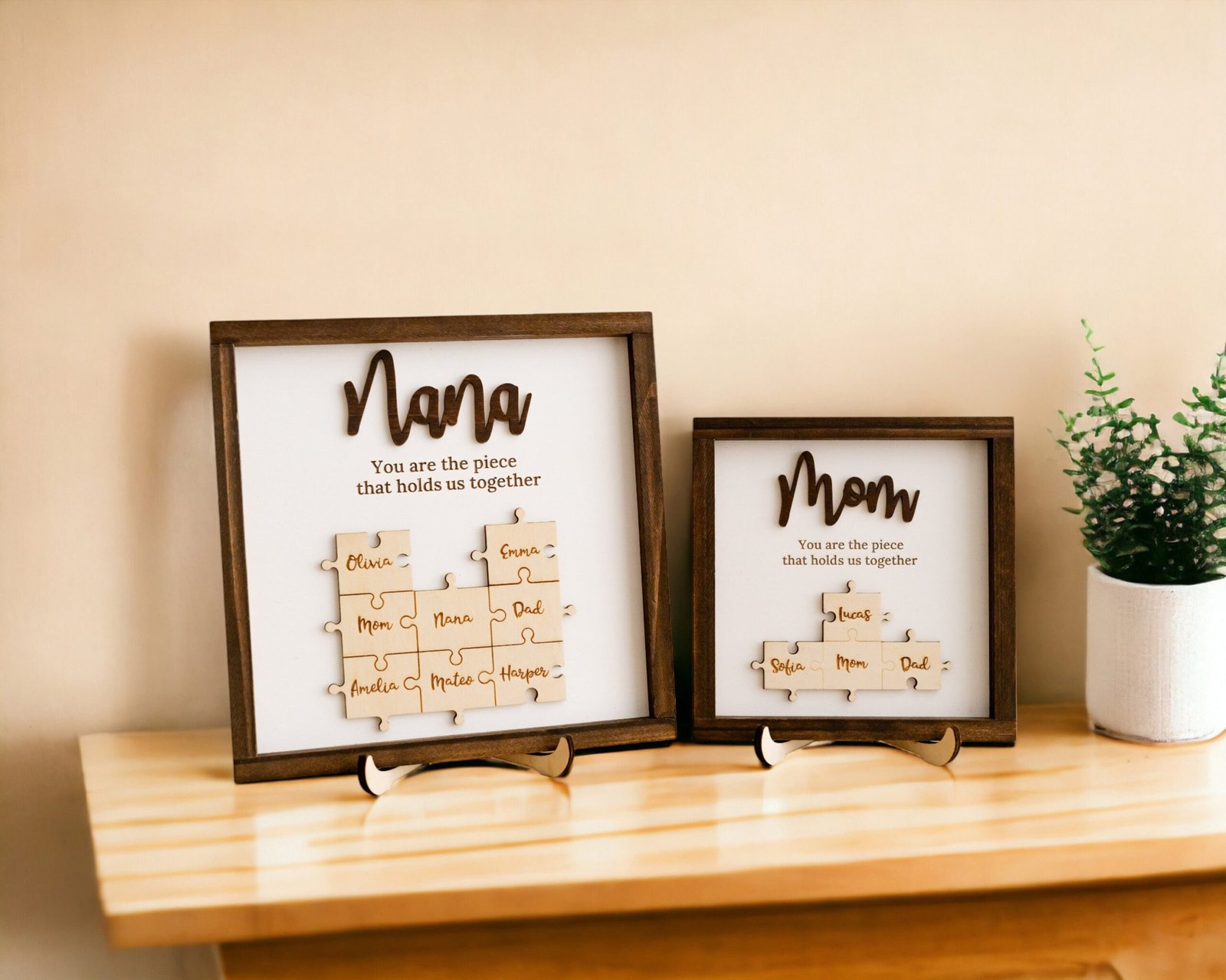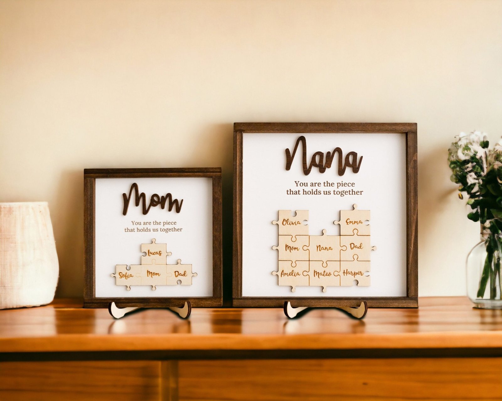 TheĀ Mama Puzzle Piece SignĀ is more than just home dĆ©corāit’s a symbol of love, unity, and appreciation. Designed to reflect the powerful role a mother plays in holding her family together, this handcrafted sign combines elegant design with deep emotional value. Featuring a customizable set of puzzle pieces engraved with children’s or family membersā names, this heartfelt piece is ideal for Motherās Day, birthdays, Christmas, or any time you want to show your gratitude to the matriarch in your life.