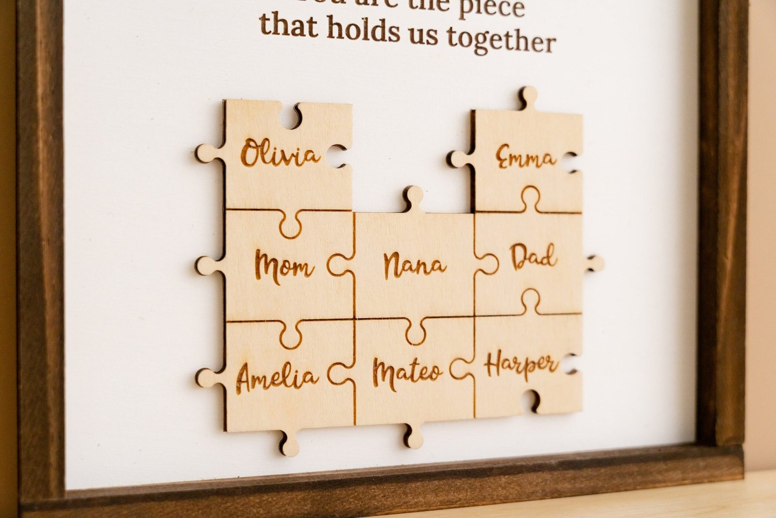 - š¬ Heartfelt Engraved MessageĀ The touching phrase āYou are the piece that holds us togetherā is deeply engraved on the faux shiplap background, adding a meaningful layer of emotion to the overall design.