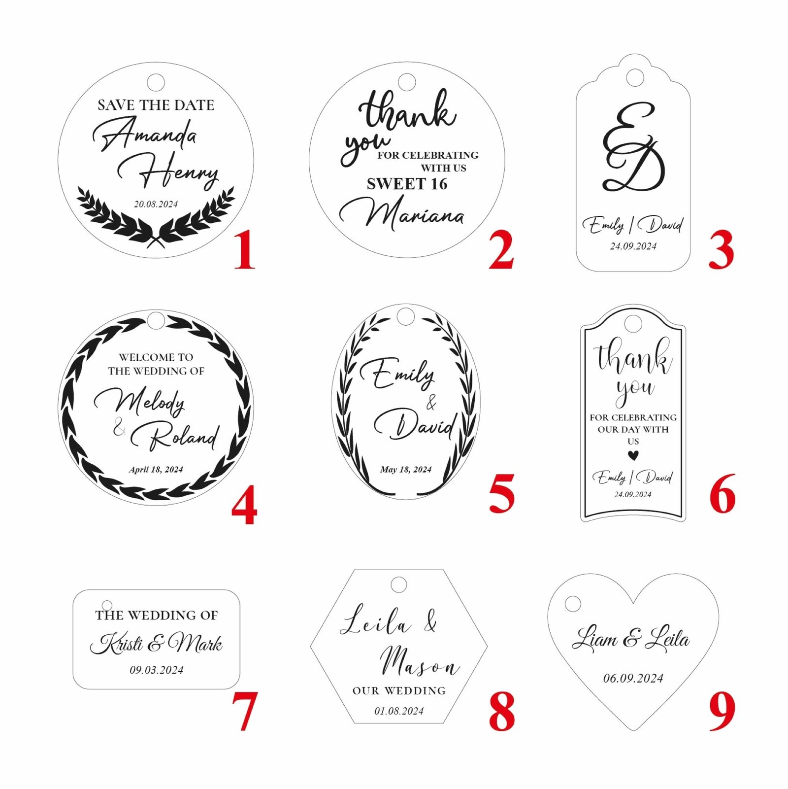 - đ Various Size Options Choose the size that best suits your event aestheticâfrom dainty mini-tags to statement-sized decor pieces.